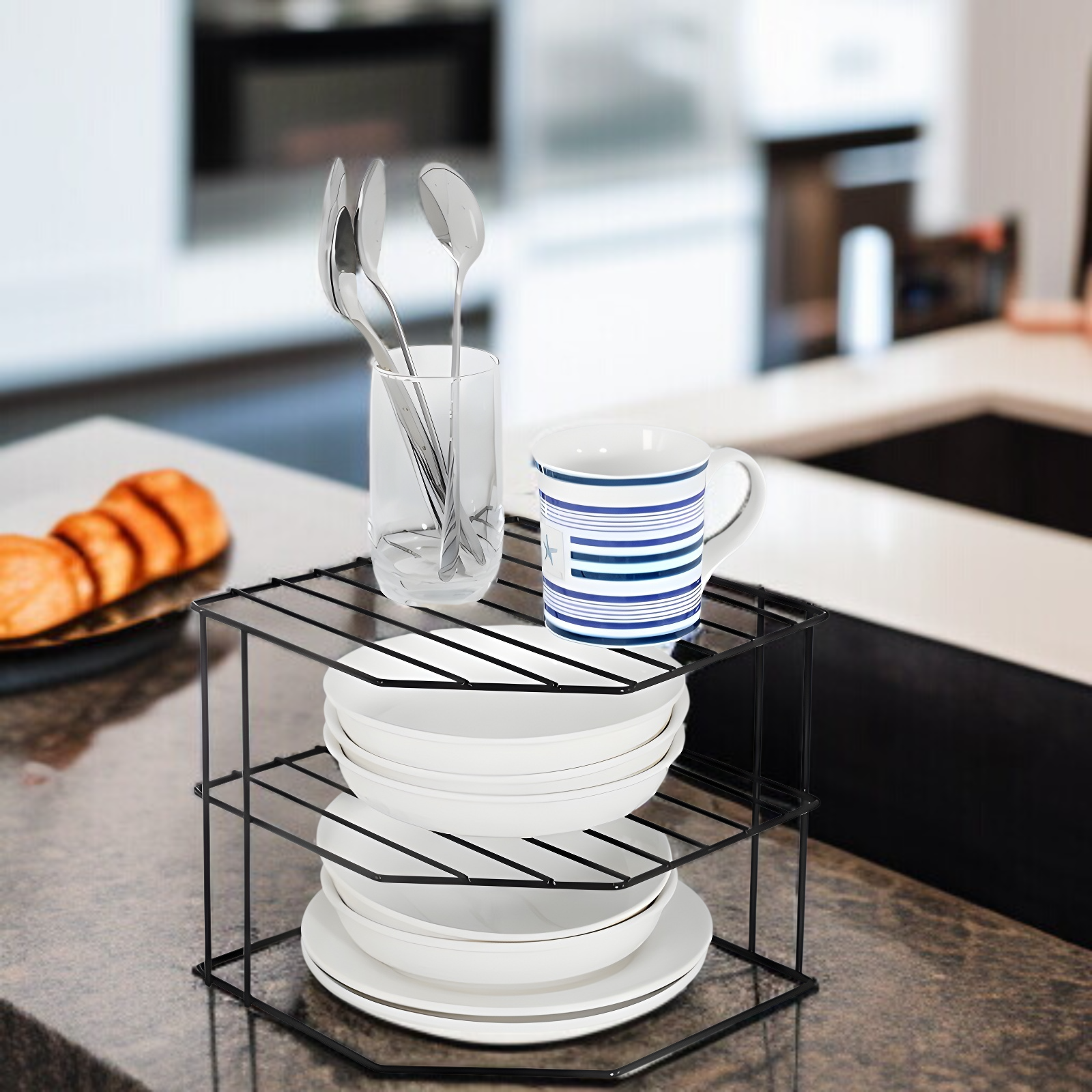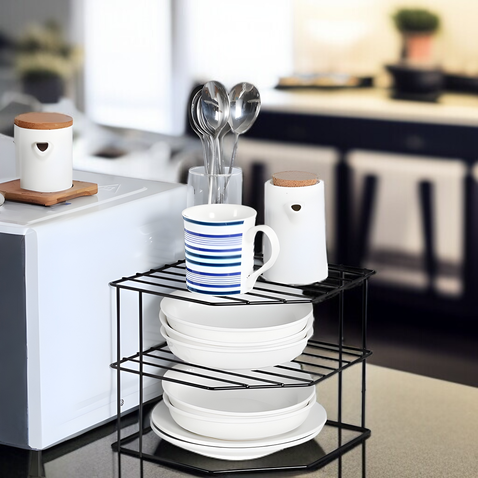 ● 扇形のコーナーデザインでデスクやキッチンなどの隅にピッタリフィット、省スペースを有効活用しながら収納力をアップします。